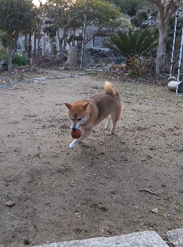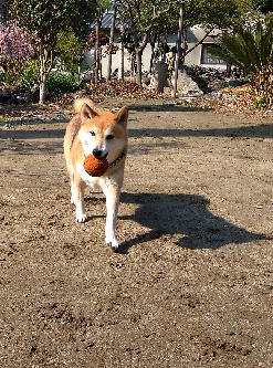 張りきりすぎる柴犬さん、途中でボールを取り落とします。