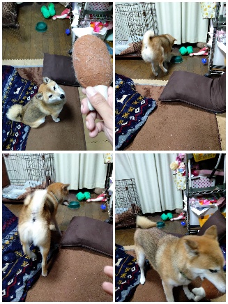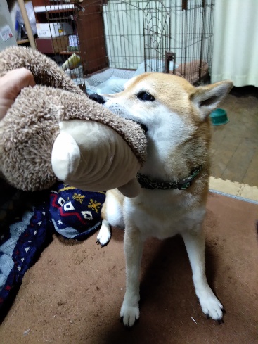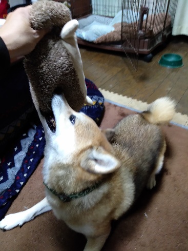 やる気マックスな柴犬さん。このハリネズミさんの噛み心地が良いらしい。