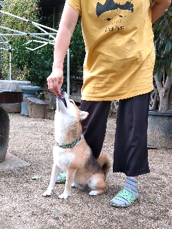 そして、オヤツもってるママの足元でお利巧におすわり!