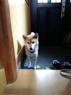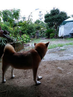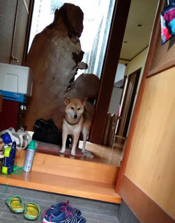 行く気だった柴犬さんでしたが、玄関で雨の音を聞いて躊躇(*'▽')