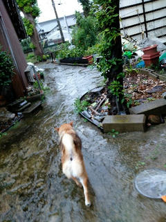 無理やり連れだしたら、軒下で悩んでました。