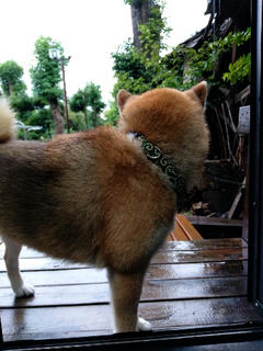 外に出ようと思ったら、雨が降っていて、諦めた柴犬さくら。
