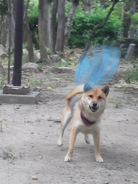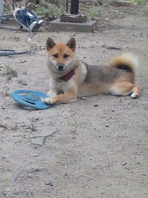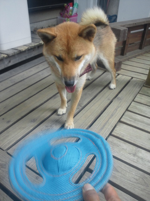 プラスチックのフリスビーが、ちょっと怖い柴犬さくら