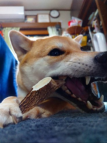 さてさて柴犬まいちゃん、鹿角もらってご機嫌。