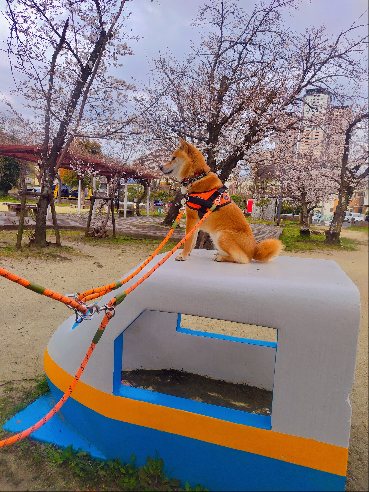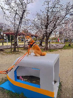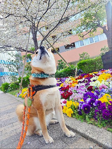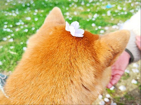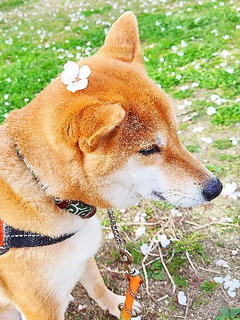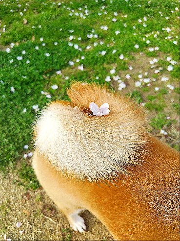 桜の花が乗っかるか、柴犬さんが乗っかるか(笑)