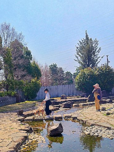 弁天池の吊り橋と飛び石で遊ぶ柴犬さん