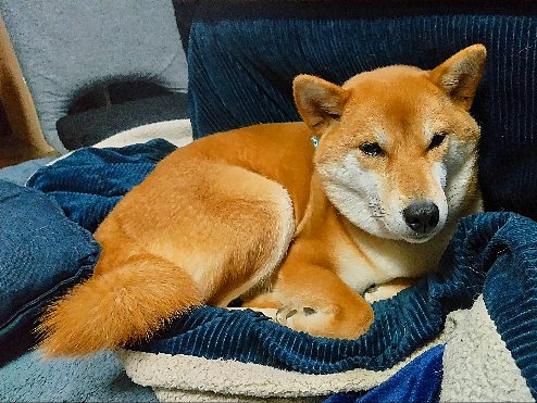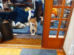 暖かくなってきたから、着替えるか悩むワンの柴犬まいに