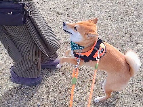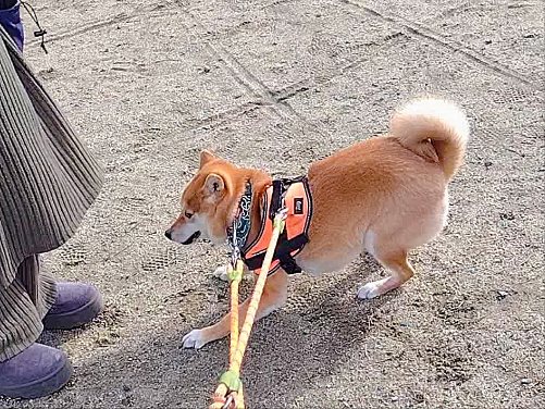 置いて行かれないように、スタンバイするワンの柴犬まいに