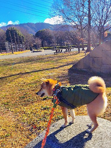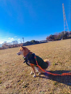 芝生広場で凧を見つめていた柴犬まいちゃん。