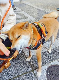 東側の門の傍で肉串を見つけた柴犬まいちゃん。