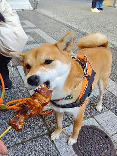 年始から肉串、良い年になりそうわんの柴犬まいに