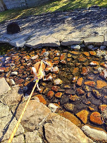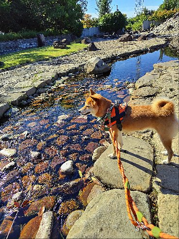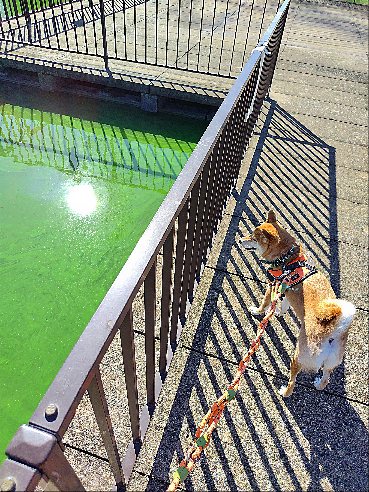 気持ち良い秋晴れ、川を眺める柴犬まいちゃん。