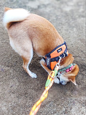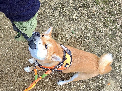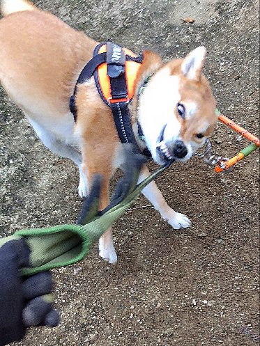 作業用の手袋をゲットしようと必死な柴犬まいちゃん。