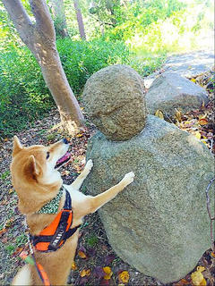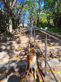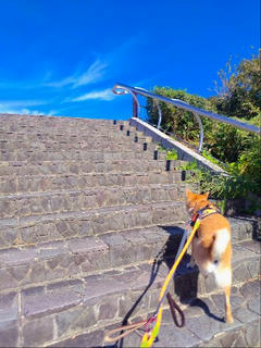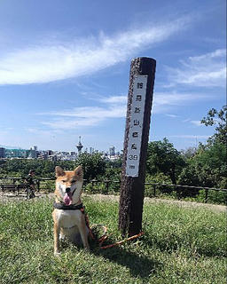低くても山の上まで登ったから疲れたワンの柴犬まいに