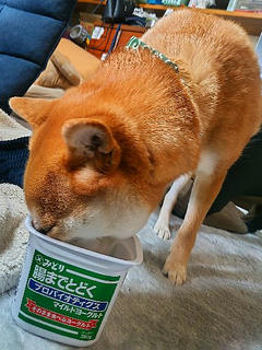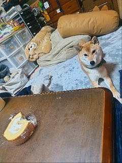 テーブルの上には一応手出ししない柴犬まいちゃん。